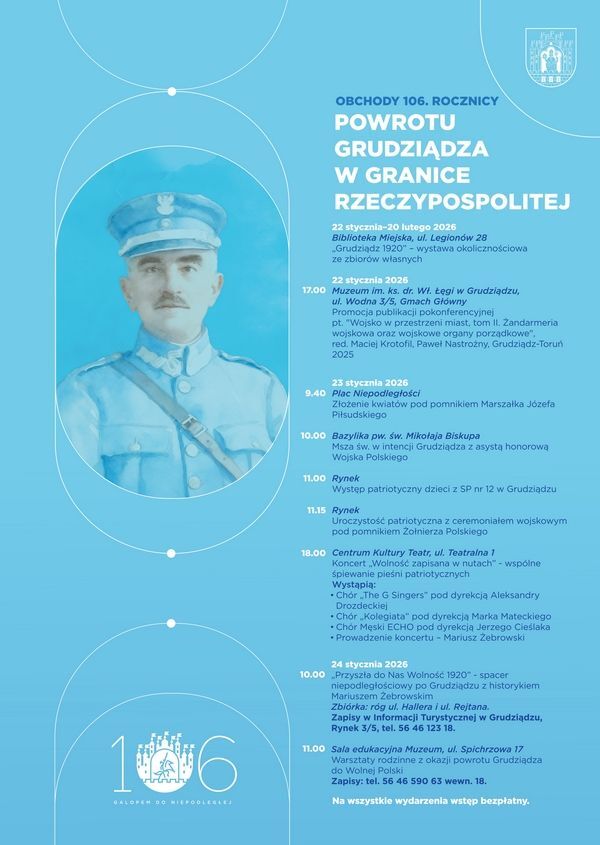 Natomiast program obchodów 106. rocznicy powrotu Grudziądza w granice Rzeczypospolitej to także wiele dodatkowych wydarzeń w przestrzeni miasta - szczegóły na plakacie poniżej: