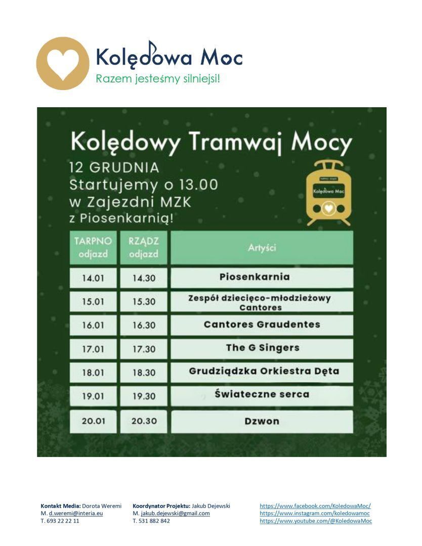 Zaśpiewają i zagrają dla Grudziądzan i Grudziądzanek w ciągu 420 minut ponad 100 kolęd i pastorałek. Kolędowy Tramwaj Mocy zakończy kursowanie o godz. 21.00 na pętli w Tarpnie.