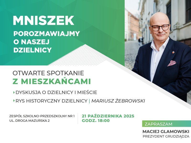 Trwają spotkania prezydenta Grudziądza z mieszkańcami w ramach cyklu „Porozmawiajmy o mieście”. Kolejne odbędzie się we wtorek, 21 października, o godzinie 18:00 w Zespole Szkolno-Przedszkolnym nr 1 przy ul. Droga Mazurska 2 w Mniszku.