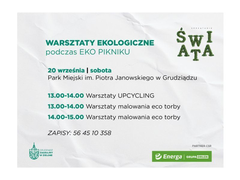 Już w sobotę, 20 września, Grudziądz ponownie włączy się w ogólnopolską akcję Sprzątanie Świata, a popołudniu mieszkańcy spotkają się na Eko Pikniku Grudziądz Zagrajmy w Zielone w Parku Miejskim im. Piotra Janowskiego.