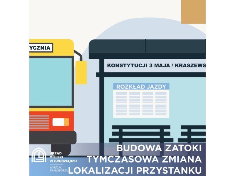 Wydział Transportu Urzędu Miejskiego w Grudziądzu informuje, że od poniedziałku, 6 października, w związku z budową zatoki przystankowej wyłączony z użytkowania zostanie przystanek Konstytucji 3 Maja / Kraszewskiego w kierunku centrum.