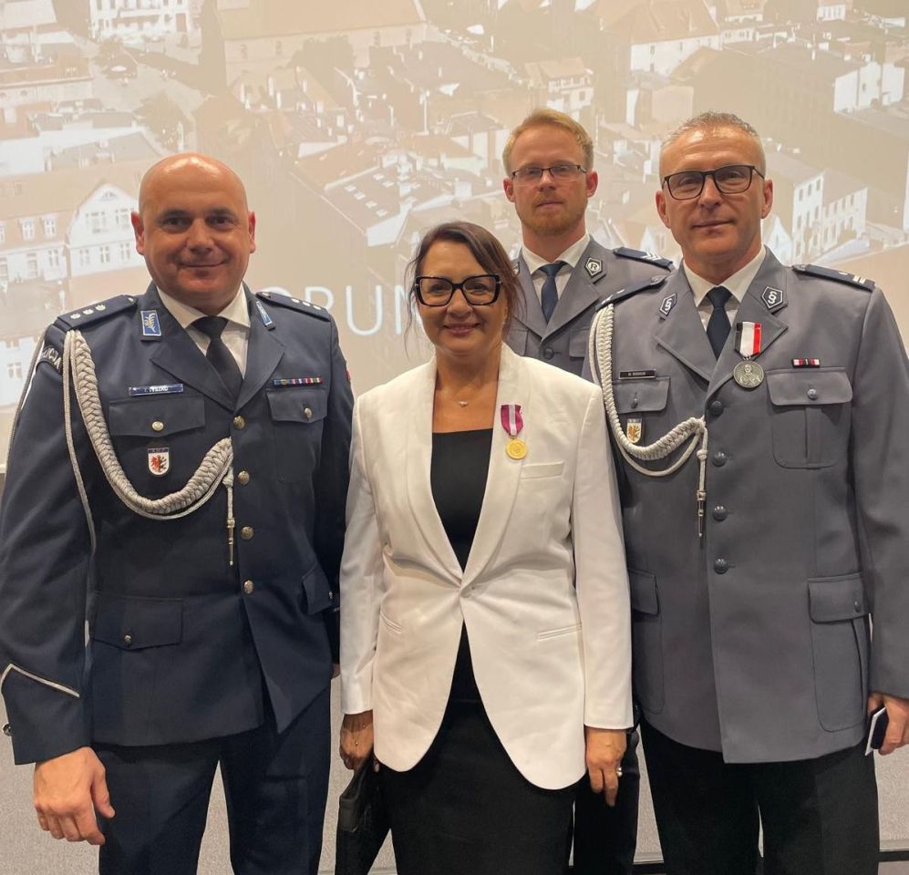 Wyróżnienia otrzymali funkcjonariusze i pracownicy, których codzienna praca i zaangażowanie przyczyniają się do poprawy bezpieczeństwa mieszkańców regionu. Złoty Medal za Długoletnią Służbę, nadany przez Prezydenta Rzeczypospolitej Polskiej, otrzymała Pani Ewa Ochocka z Zespołu ds. Kadr, Szkoleń i Prezydialnego. To wyraz uznania za wieloletnią, rzetelną i profesjonalną służbę.