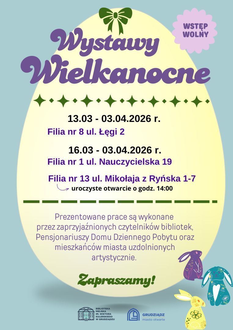 W poniedziałek 16 marca 2026 r. ozdoby świąteczne pojawią się również w Filii nr 1 na osiedlu Lotnisko. Tego samego dnia o godz. 14:00 w Filii nr 13 przy ul. Mikołaja z Ryńska 1–7 odbędzie się uroczyste otwarcie wystawy ozdób świątecznych wykonanych przez pensjonariuszy Domu Dziennego Pobytu w Grudziądzu.