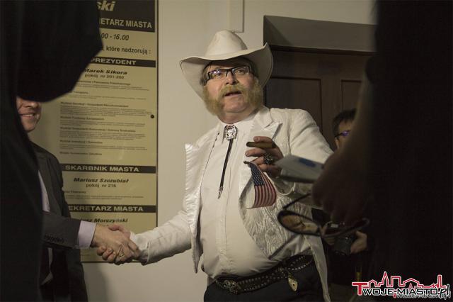 Amerykański biznesmen wybrał się z wizytą do wiceprezydenta Grudziądza - Przemysława Ślusarskiego. To happening promujący startującą w sobotę jubileuszową edycję Festiwalu Grudziądzka Wiosna Teatralna.