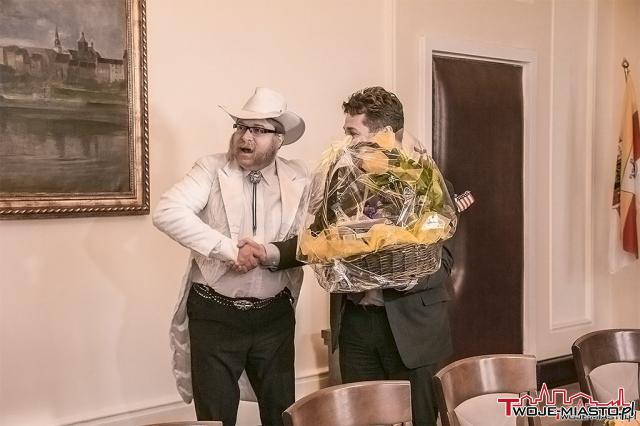 Amerykański biznesmen wybrał się z wizytą do wiceprezydenta Grudziądza - Przemysława Ślusarskiego. To happening promujący startującą w sobotę jubileuszową edycję Festiwalu Grudziądzka Wiosna Teatralna.