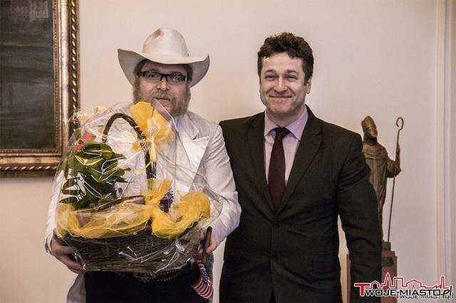 Amerykański biznesmen wybrał się z wizytą do wiceprezydenta Grudziądza - Przemysława Ślusarskiego. To happening promujący startującą w sobotę jubileuszową edycję Festiwalu Grudziądzka Wiosna Teatralna.