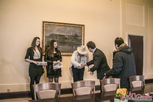 Amerykański biznesmen wybrał się z wizytą do wiceprezydenta Grudziądza - Przemysława Ślusarskiego. To happening promujący startującą w sobotę jubileuszową edycję Festiwalu Grudziądzka Wiosna Teatralna.